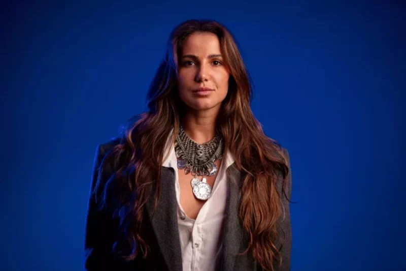 Imagem não clicável: Fabi Justus, dona da marca Les Cloches. Mulher branca com cabelo curto, olhos verdes, blaser azul, camisa azul e gravata preta, ao fundo cabide com roupas de sua marca