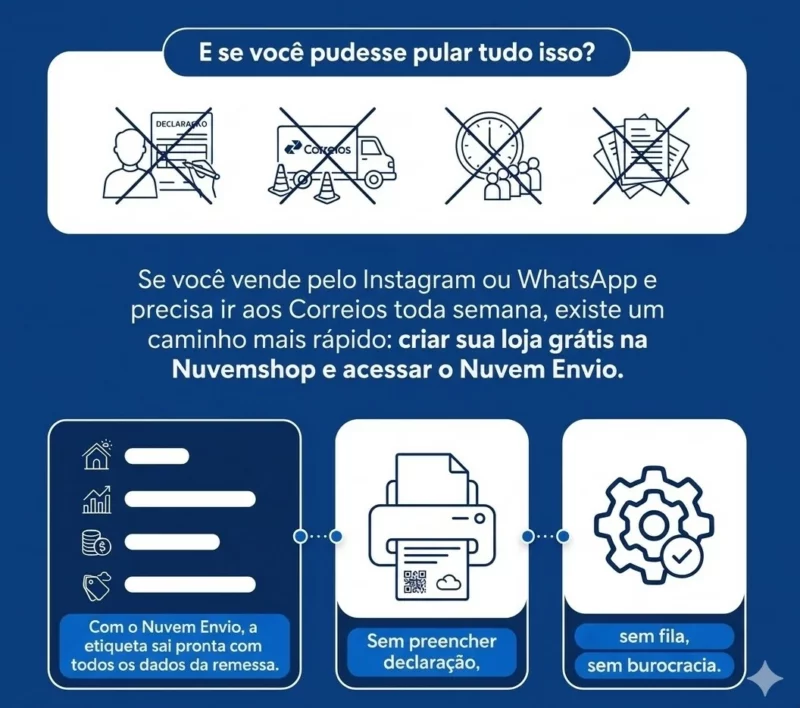 Não. As etiquetas geradas pelo Nuvem Envio já contêm todas as informações exigidas pela regulamentação. Você não precisa preencher nenhuma declaração adicional — é só imprimir a etiqueta e despachar.
