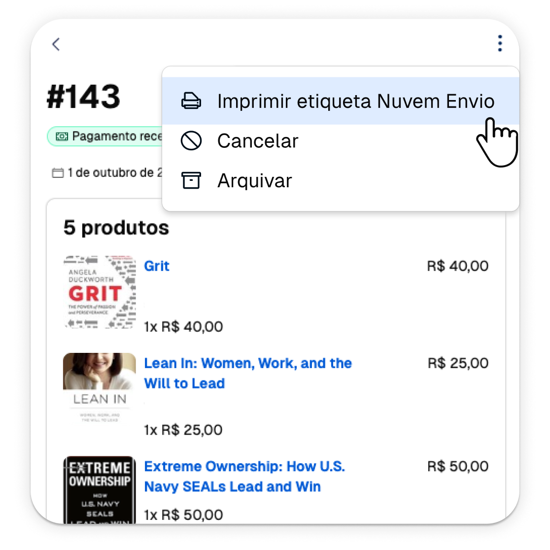 Entre no pedido específico e selecione a opção de impressão de etiqueta com Nuvem Envio.