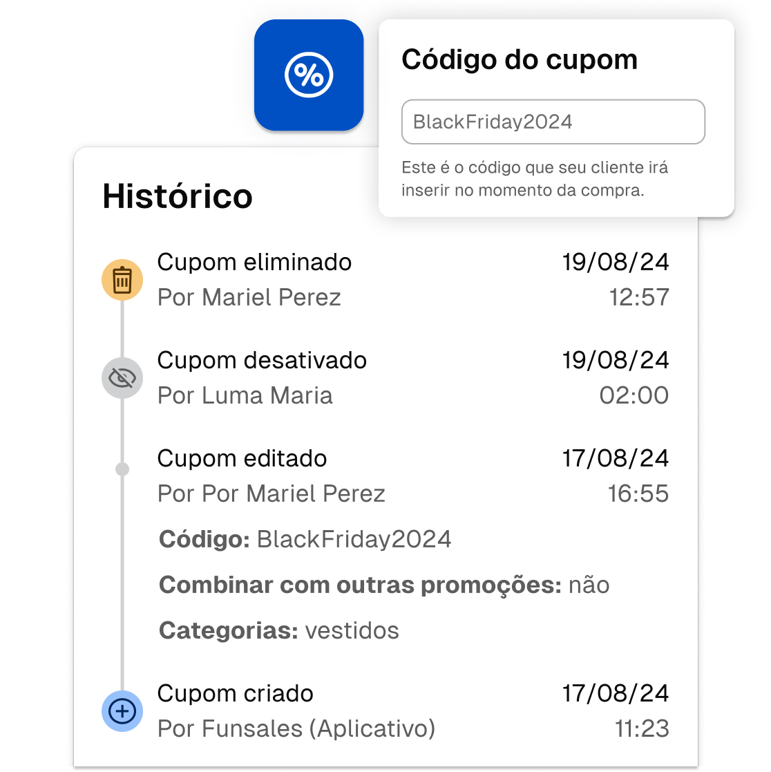 Conheça o histórico de quando e quem criou ou modificou um cupom e obtenha rapidamente as informações necessárias para gerenciar seus cupons.