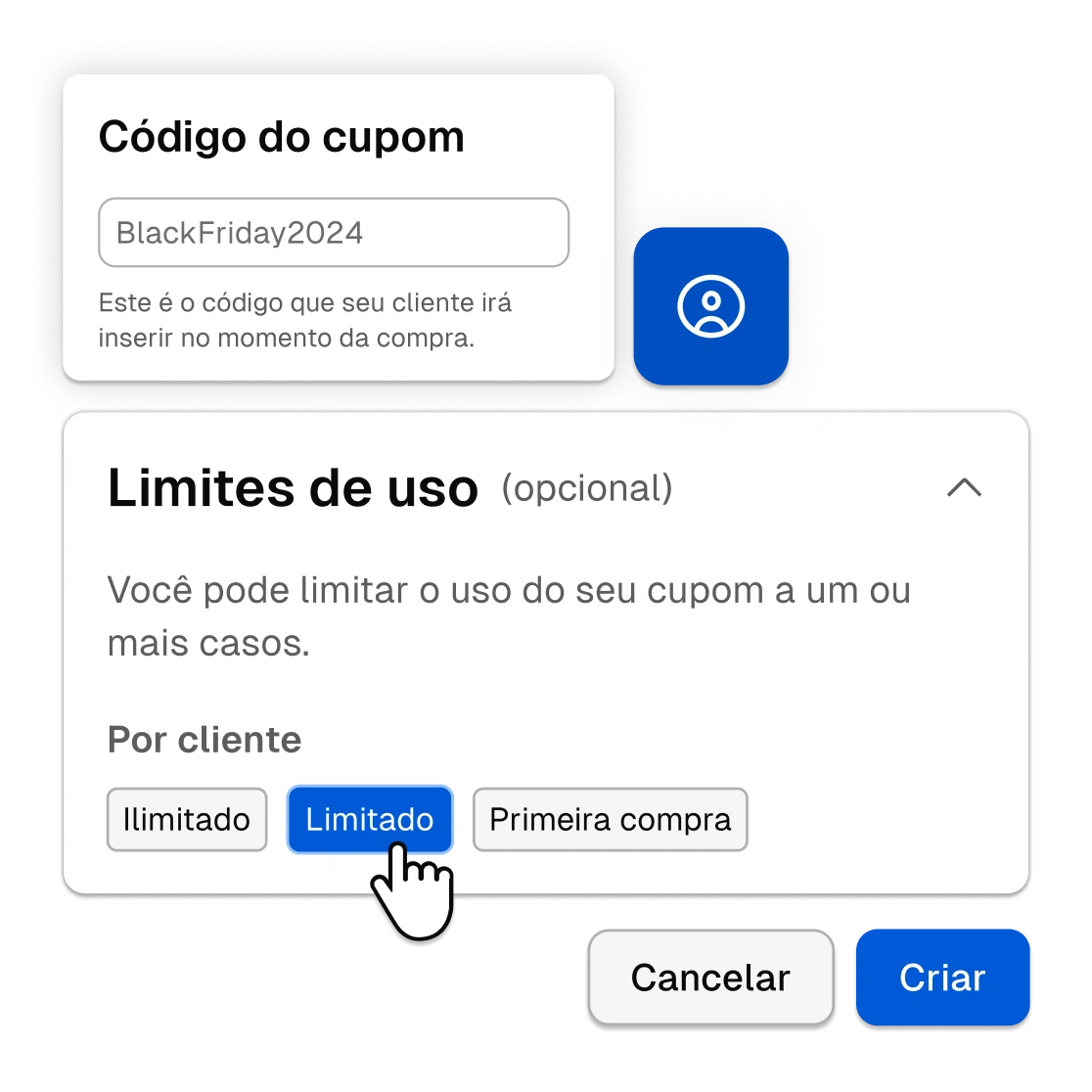 Limite o uso de cupons por cliente! Você decide o número máximo de usos por cliente, para otimizar suas promoções e ter uma gestão de benefícios mais estratégica.